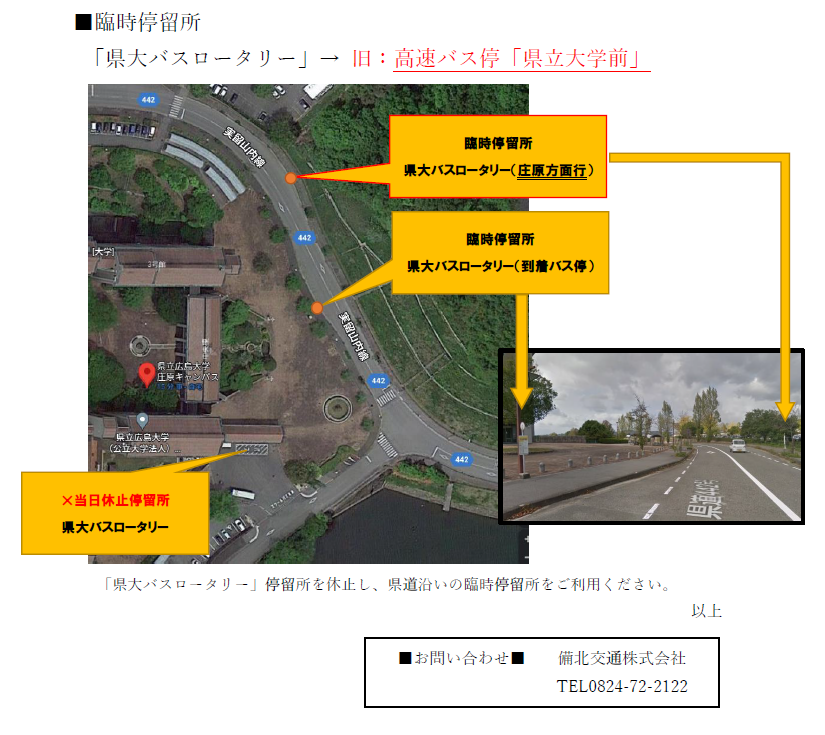 いつも備北交通バスをご利用いただき誠にありがとうございます。県立広島大学庄原キャンパス「白楊祭」開催のため、下記の通り臨時停留所に移設いたします。